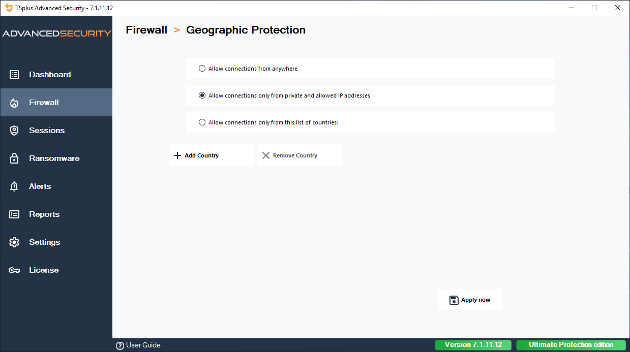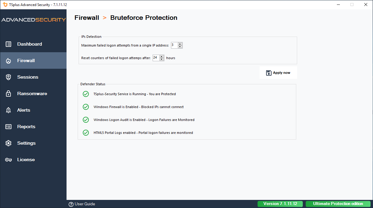 Easily configure the maximum logon attempts by IP address. In addition, Bruteforce Protection displays the current status of the Advanced Security service, Windows Firewall, Windows Logon Audit and HTML5 web portal logs.