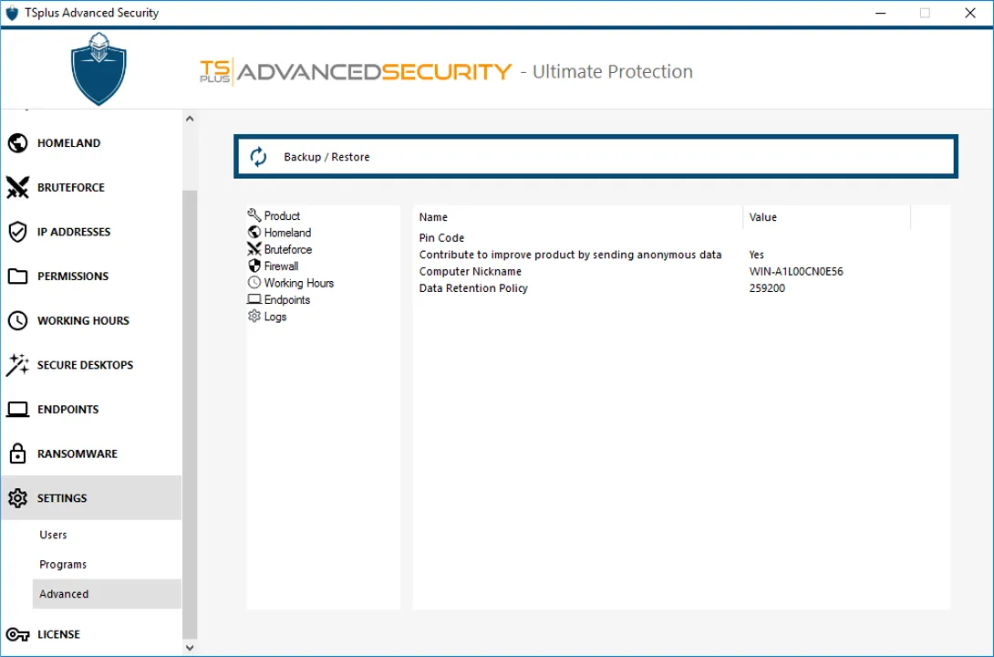 Backup/Restore data and settings in a secure and private database, deactivate the Windows firewall to use the TSplus Advanced Security built-in firewall, enable/disable service and functionalities logs, and more!
