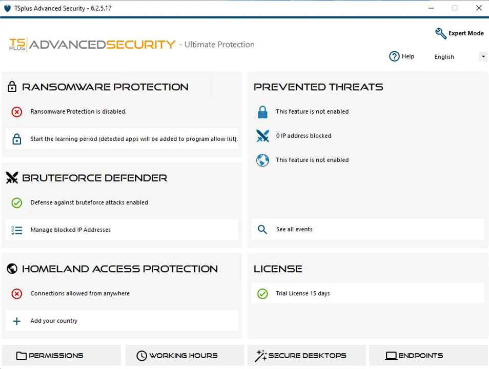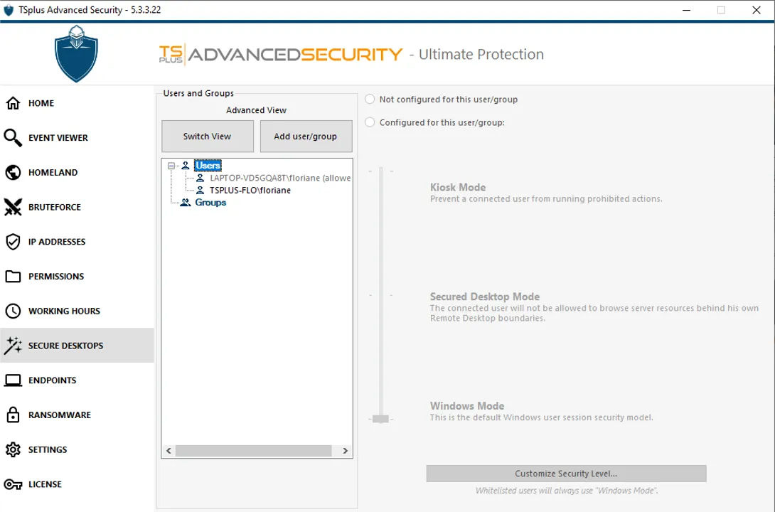 After launching TSplus Advanced Security, easily configure the main security features using the lite mode on the top right corner.